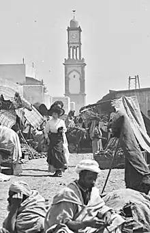 A photo of the original tower seen from the soq kbir market published in 1911, after the 1907 bombardment and before the establishment of the protectorate in 1912.