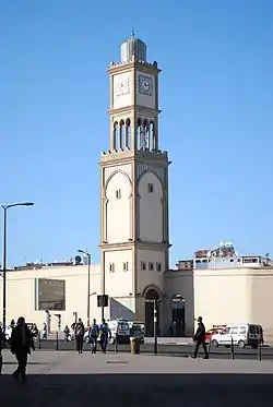 The Casablanca Clock Tower (Arabic: برج الساعة بالدار البيضاء, French: Tour de l'horloge de Casablanca) is a clock tower in Casablanca, Morocco. Located in United Nations Square, the tower is a 1993 reproduction of one of the oldest French-built structures in the city. The original tower was built in 1909 by the French commander Charles Martial Joseph Dessigny, and designed by Le Capitaine du Génie Bouillot,[1] as an identical copy of one he had built in Aïn Séfra when stationed there previously.[2][3][4][5]