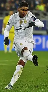 Casemiro scored four goals in 25 matches in the 2016–17 La Liga, helping his team win the league title for the first time in five years.[33][34] He then scored a long-range strike in the Champions League final against Juventus, helping his team to a 4–1 victory.[35] He again found the net on 8 August, putting his team ahead in a 2–1 victory over Manchester United in the 2017 UEFA Super Cup.[36]