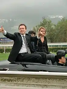 Caspar Fownes (front), An Australian horse trainer based in Hong Kong. He is celebrating a first Hong Kong Derby win