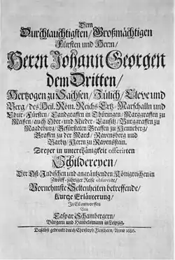 - Dem Durchlauchtigsten Großmächtigen Fürsten und Herrn Herrn Johann Georgen dem Dritten Hertzogen zu Sachsen [...] Dreyer in unterthänigkeit offerirten Schildereyen Der Ost Indischen und angräntzenden Königreichen in Zwölff=jähriger Reise observirte Vornehmste Seltenheiten betreffende Kurtze Erläuterung In Eil entworffen Von Caspar Schambergern Bürgern und Handelsmann in Leipzig. Daselbst gedruckt durch Christoph Fleischern Anno 1686.
