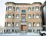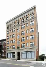The Naomi Apartments is an Italian Renaissance apartment building, constructed in 1924 and designed by Pollmar and Ropes. It is a six-story brick structure measuring 60 feet by 166 feet. The facade is symmetrical, with a stone-covered first floor and stringcourse above, separating it from the upper floors. The windows are regularly arranged, with a flat arch overtop. The sixth floor has ornate arched window openings, with a cornice frieze below the floor and another decorative cornice above.[2] The building has undergone $17 million renovation and restoration beginning in 2014 and has reopened in 2017.