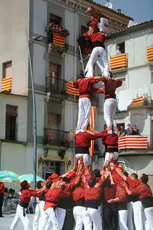 Pillar of 5 by the Castellers de Sarrià in Sant Jaume square, Barcelona