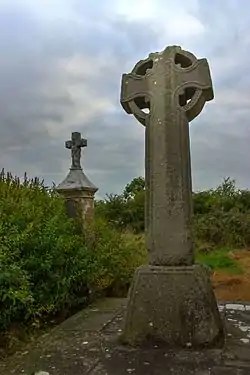 Three sandstone high crosses are on the site. A fourth cross is in the river. According to legend, Columba was stealing the cross, was caught by Ciarán and quickly dumped the cross in the river.[6] They are called termon crosses (from the Irish tearmann, "border") which marked the sānctissimus, the holiest part of the monastery around the church.