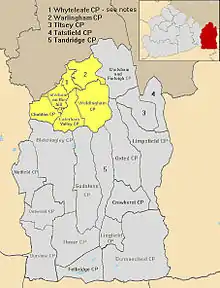 Caterham and Warlingham was abolished in 1974 due to the Local Government Act 1972 to form the north-west of the Tandridge (district) which is the easternmost part of the county and covers a much larger area, shown in red in the inset map and in grey and yellow in the main section of map.[1]