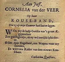 Catharina Questiers (21 November 1631 – 3 February 1669) was a Dutch poet and dramatist. Along with Cornelia van der Veer and Katharyne Lescailje, she was the most successful female Dutch poet of the second half of the 17th century. Her brother David also achieved some note as a poet.