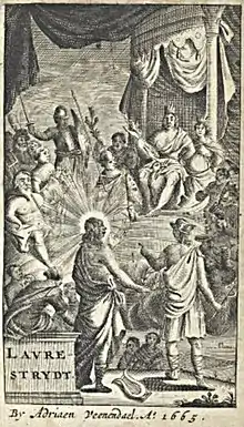 During the 17th century, it was quite common for poets to create works together, going back and forth in friendly, poetic responses of one topic or another. Between November 1662 and January 1663, Catherina, and her childhood friend, Cornelia van der Veer, wrote a series of poems together, that was published in 1665. It was called the Battle for the Laurels between Catherina Questiers and Cornelia van der Veer. It included ten poems in which the two attempted to battle to see who was more deserving of the poet's laurel wreath, which was a classical tribute to eminent poets. In the spirit of good-nature, the battle was deemed a tie. In total, Catherina contributed 31 poems, while Cornelia contributed 51. There were also other poems written by friends that they included in the book, bringing it to a lengthy 375 page, limited edition.[3]