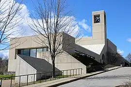 A good example of Brutalist architecture, St. Paul's Cathedral is built of exposed poured-in-place reinforced concrete, featuring a coffered sanctuary, textured surfaces from vertical formwork, and carefully proportioned and patterned joints.[4] The interior finishes include white oak furnishings and acoustic paneling and a slate floor. It is naturally lit from the skylights and a large curtain wall, which provides a view of Lake Champlain and the Adirondacks. The campanile holds eight bells from old St. Paul's. They were cast in 1895 by the Clinton H. Meneely Bell Company of Troy, New York.[5] The bells were refurbished after the fire and rehung in the new bell tower. A ninth bell cracked in the fire and is now at the foot of the tower, adjacent to the Memorial Garden gate. The Memorial Garden is located to the east of the church. The ashes of parish members and friends of St. Paul's are buried there. It is enclosed with stonework that incorporates stones from old St. Paul's.
