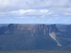 Cathedral Mountain has an elevation of 1,387 metres (4,551 ft). The western side of this mountain has a spectacular and extensive cliff face which plunges some 700 metres (2,300 ft) to the Mersey Valley floor.