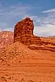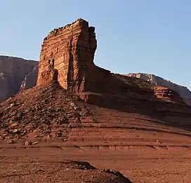 Cathedral Rock is located on the Colorado Plateau. This erosional remnant is composed of red sandstone of the Moenkopi Formation, which was laid down during the Triassic. It is overlain by a Shinarump Conglomerate caprock.[4] Precipitation runoff from this feature drains to the nearby Colorado River, one-half mile to the east.