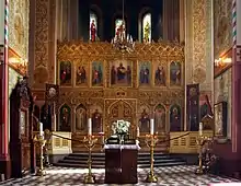 The cathedral is richly decorated and has eleven bells cast in Saint Petersburg, the largest of which weighs about 16 tons, more than the other ten combined. It has three altars, with the northern altar dedicated to Vladimir I and the southern to St. Sergius of Radonezh.