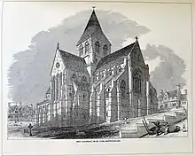 Construction of the first stone church was begun in 1843 under the direction of Aubrey Spencer, the first Bishop of Newfoundland and Bermuda.[5][6] Little progress was made on this relatively modest edifice beyond the laying of a cornerstone before Spencer resigned due to ill health. The stone church was destroyed in the Great Fire of 1846.