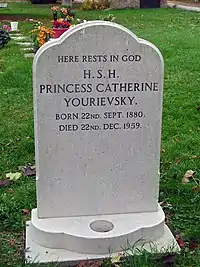 - ↑ From a newspaper report quoted by Tarsaïdzé in Katia: wife before God (1970), at p. 311: "Russian Princess Laid to Rest at Hayling: A simple, but very unusual, funeral took place at the little church of St. Peter, North Hayling, on Tuesday. An 84-year-old [sic] Russian princess, Catherine Yourievsky, whose father, Alexander II, had been assassinated, and who had walked for miles without food during the Revolution, suffering great hardship, was laid to rest..."