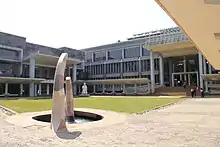 The university hosts an environment-friendly Learning Resource Centre (LRC) as an example of ecologically sustainable design in the region.[7] Designed by Kenyan architect Musau Kimeu, the LRC consists of three buildings—a 3000-seat modern library, a 1200-seat state-of-the-art auditorium and a 500-seat cafeteria. The buildings are arranged around a 50m by 40m central square and tied together by a covered walkway with outdoor seating. The central area of the grass-covered square is adorned on opposite corners with a fountain and a three-metre high statue of Pope Paul VI by Ugandan artist Leonard Kateete.[7]