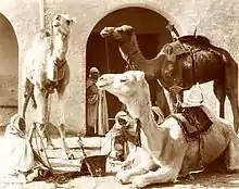 - 1 2 3 Méhara was originally an Arabic masculine singular noun[29] used in North Africa to refer to dromedary camels. As it acquired its modern sense the singular form became méhari,[30] with the plural form eventually becoming méhara[29] or, optionally, méharis.[30] The modern word refers to a camel which is ridden by a méhariste, a person who rides a méhari or méhara for the purpose of travel through the desert. Méhara dromedaries are taller and slimmer than dromedaries used as pack animals. They are supremely noble animals, svelte, proud in appearance, and with a coat of white fur. They are animals for riding, suitable for razzias (military raids) and racing, and originate from Algeria.