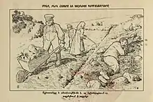 In 1843, during his visit to Russian Transcaucasia, German Baron August von Haxthausen also visited the German colonies of Georgia and the Tiflis region and extensively described their agricultural practices. He related an account from Moritz von Kotzebue about an unsuccessful religious pilgrimage of German colonists to Jerusalem, led by a woman who "knew the whole Bible by heart, from beginning to end" and who "exercised a kind of magical influence on all around her."[19] During his travels in the Caucasus, Haxthausen was accompanied by Peter Neu, a Swabian colonist from the Tiflis area who had "a remarkable genius for languages and knew a dozen European and Asiatic tongues,—German, French, Russian, Circassian, Tatar, Turkish, Armenian, Georgian, Persian, Kurdish, etc." In addition, he "possessed a rich gift of poetical imagination and had an inexhaustible treasury of märchen, legends and popular songs, gleaned from all the countries he had visited."[20] Neu accompanied Haxthausen, Khachatur Abovian and Abovian's uncle Harutiun on a visit to the Yazidi community of Armenia.[21] Haxthausen, Abovian and Neu also visited the center of the Armenian Apostolic Church at Etchmiadzin and Neu accompanied Haxthausen on an excursion to the area of present-day South Ossetia.[22]