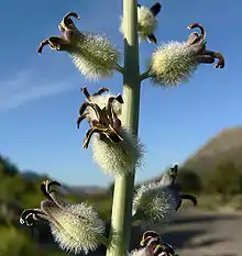 Caulanthus crassicaulis is a species of flowering plant in the family Brassicaceae known by the common name thickstem wild cabbage. It is native to the western United States where it is a member of the flora in sagebrush, woodland, and desert scrub habitats. This is a perennial herb producing a stout, inflated stem from a woody caudex base. The leaves form a basal rosette and occur at intervals along the stem. They are broadly lance-shaped on the lower stem and much smaller and linear in shape farther up. They may have smooth, toothed, or deeply cut edges. The rounded flower has a coat of thick, pouched sepals which part at the flower tip to reveal narrow dark purple or brown petals. There are two varieties of this species: var. crassicaulis generally has hairy flowers, while var. glaber has hairless. The fruit is a long, thin silique which may approach 13 centimeters in length.