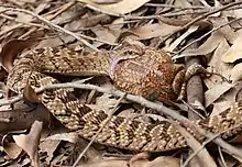The color pattern consists of a ground color that is usually some shade of brown (possibly pinkish or grayish-brown), but occasionally olive green. This is overlaid with a pattern of 20–30 rhombic blotches that have pale edges, as well as a sprinkling of black scales and oblique black bars on the sides.[4] Each oblique black bar is topped by one or two black spots, each with a pale centre, and strongly resembling an eye. Northern populations may be patternless,[3] making them difficult to identify, while in others the pale edges may be missing, the rhombic blotches may be a darker color, or there may even be a dark brown vertebral stripe. The head has a characteristic V-shaped mark that may be solid black, or brown with a black outline.[4]