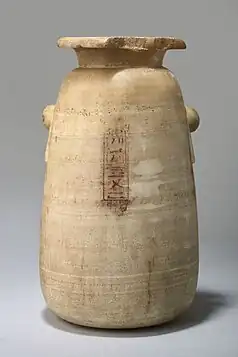 The Caylus vase is an Egyptian alabaster jar dedicated in the name of the Achaemenid king Xerxes I (c.518–465 BCE) in Egyptian hieroglyphs and Old Persian cuneiform, which in 1823 played an important role in the modern decipherment of cuneiform and the decipherment of ancient Egyptian scripts.