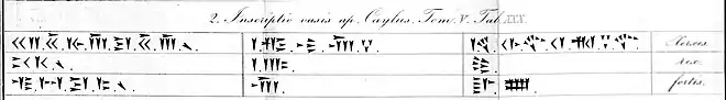 Grotefend presented his deductions in 1802, but they were dismissed by the Academic community, and denied publication.[8] Grotefend had also proposed a reading of the cuneiform inscriptions on the Caylus vase since 1805, translating it quite accurately as "Xerxes rex fortis" ("Xerxes, the Strong King", although it is actually "Xerxes, the Great King").[9][10][11][12] He was the first to make this suggestion.[10]