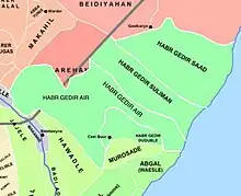 Ayr (Somali: Cayr or Ceyr), Muhammad Madarkicis Hiraab is a Somali clan, part of the larger Habar Gidir Hawiye clan. The Ayr clan is the eldest Habargidir sub-clan and is the largest Habargidir sub-clan numerically.[1] The Ayr clan have a rich history in Somali society and has played a fore role in shaping Somali history and national politics. They reside in 6 out of the total 18 regions of Somalia but are primarily found in the central region of Somalia, Galgaduud which they hold a monopoly over and is considered their heartlands. They are the most powerful sub-clan in central and southern Somalia controlling important sections of the country and have a great influence over the nation's capital Mogadishu.[2]