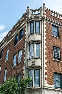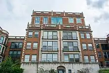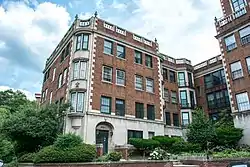 The building had a 335-foot (102 m) frontage on Cedar Glen Parkway, a 200-foot (61 m) frontage on Ambleside Drive.[33] The building's access road was set back 30 feet (9.1 m) from Cedar Glen Parkway, and the structure's east wall 20 feet (6.1 m) from Ambleside. Ample vacant land at the rear of the building provided privacy. The first floor of the Georgian Revival-style[37][39] building's exterior was clad in Indiana limestone, with the upper floors consisting of exposed brick with limestone trim at the corners[35] and around the doorways. The windows were trimmed with stone.[37] The building frame was steel, with walls, floors, and the roof of reinforced concrete.[36] The cornice was topped by a balustrade consisting of terra cotta balusters and a stone railing. Stone urns rested atop the balustrade.[37] The structure's exterior and interior masonry walls were certified by the Cleveland Clay League as using locally sourced materials, fireproof, and attractive.[40] The E-shaped building had a garden forecourt 75 feet (23 m) deep and 100 feet (30 m) long. The apartment complex itself consisted of a six-story central tower equipped with an elevator, and two four-story walk-up wings (e.g., equipped with stairs but no elevator).[35] Each wing, each connection, and the central tower all had their own entrances.[37] The building had an underground[33] 40-car garage[36] with internal staircases (so patrons did not have to exit the garage to reach the interior of the building).[35]
