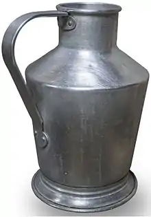 A Cegléd jug is a 7–9 liter metal jug for water, with a handle and a lid. It is a relatively modern invention. They were first manufactured by a János Rónay in Cegléd in the 1910s. Before the wide distribution of water pipelines, Cegléd jugs were popular for delivery of water to farmers during harvest, construction and other workers away from residential places.[1] They quickly became popular, because they were not fragile like pottery jugs, easy to carry by hand, on bicycle or in a car, and were easy to clean. Since there was only one manufacturer for a long time, the name stuck.[2]