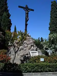 In 1895, the sculptor Antonio Susillo made a crucifix.[3] There's no telling who commissioned him to do it. On December 22, 1896 Susillo committed suicide. In June 1897, the Town Hall proposed to place Susillo's crucifix in a roundabout on the main avenue of the cemetery. The Town Hall bought the crucifix in October 1897 for 14,000 pesetas. It was placed on a recreation of Golgotha in 1907. The Christ is made of bronze, and the mount is made of piled up rocks. It was baptized by the people as the Christ of the Honey because in the summer of 1907, honey came out of his mouth. This was interpreted as a miracle, although the most likely explanation is that the heat caused a honeycomb to melt from the inside of his mouth.[15]