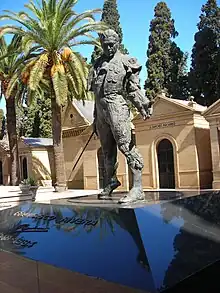 Vicente Traver made some simple tombs in charge of José Gastalavaner Gimeno (1926). Antonio Illanes made a tombstone with a cross on the floor in the family tomb of the Palomeque family. Juan José López Sáez made crosses with a pedestal for María Melantuche's pantheon (1924).[17] The bronze funeral monument of Joselito el Gallo was designed by Mariano Benlliure in November 1921, and the tomb was completed in its present location in 1926. The sculpture, which shows several people carrying the open casket, prompted a visit from Alfonso XIII in 1930.[18]
