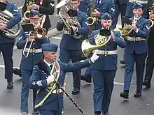 The Central Band of the CAF plays by permission of the Commandant of Canadian Forces Support Group (Ottawa–Gatineau) in Ottawa,[2] and like all Regular Force military bands, is composed solely of auditioned, military-qualified musicians. Because of its previous history as the Royal Canadian Air Force's premier band, musicians parade and attend functions in the RCAF's uniform.[3]