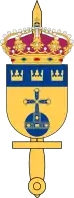 Blazon of the coat of arms of the Central Military Region: "Or, the provincial badge of Uppland, an orb azure, banded and ensigned with a cross crosslet, on a chief azur three open crowns fesswise or. The shield surmounting an erect sword or."[4]