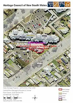 1. 1 2 3 4 5 6 7 8 9 10 11 12 13 14 15 16 17 18 19 20 "Central Mine Manager's Residence, former". New South Wales State Heritage Register. Department of Planning & Environment. H01770. Retrieved 2 June 2018. Text is licensed by State of New South Wales (Department of Planning and Environment) under CC-BY 4.0 licence.