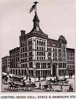 The idea for Central Music Hall was conceived by George B. Carpenter, a local promoter of concerts and lectures.[1] Carpenter was a member of Reverend David Swing's popular nondenominational Central Church, and he imagined a building to be named in its honor that would provide a home for the church and also feature a concert hall, stores, and offices.[1] Construction began in the Spring of 1879 and the auditorium (not yet fully complete) opened on December 5, immediately becoming the city's premier auditorium.[1] It was the first significant music hall to be built following the Great Chicago Fire of 1871.[2] The mixed-use building included a theater, six stories of office space and street-level storefronts.[3]