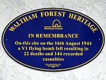 The building is on the site of a Second World War V1 flying bomb attack in 1944, which resulted in 22 deaths and 144 recorded casualties. Besides the line of shops and offices, it includes Walthamstow's clock tower.