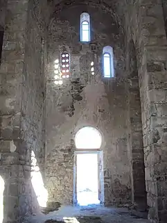 Most of the frescoes did not survive. The remains of the second stage of the painting (the first decoration was probably incomplete and was located mainly in the apses) are preserved on the northern and southern walls of the cross' lateral branches. The northern wall displays an image of two Holy martyrs above the entrance between the windows. In the Central part of the southern wall, between the door and the windows, a huge (about 3 m) image of saints Constantine and Helena holding a large cross is visible. To the right of them under the window there is a small fragment of the image of the warrior.  On the walls of the Western sleeve were depicted the Holy warriors-horsemen. On one of the arches under the dome in the 19th century was the figure of the prophet Daniel.[6]