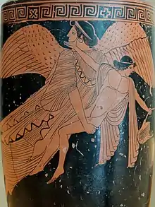 Athenians localised the myth by asserting that Cephalus was married to Procris, a daughter of Erechtheus, an ancient founding-figure of Athens.[9] The goddess of dawn, Eos,[10] fell in love with him and kidnapped Cephalus against his will when he was hunting.[2] Eos bore the resistant Cephalus a son named Phaethon (not to be confused with the son of the sun-god Helios). Some sources also give Tithonos and Hesperus as children of Cephalus and Eos. However, Cephalus never accepted Eos, and always pined for Procris, causing a disgruntled Eos to return him to her, making disparaging remarks about his wife's fidelity. Bribed by a golden crown, his wife admitted Pteleon to her bed, and being detected by Cephalus she fled to Minos.[11] Alternatively, Eos disguised Cephalus as a common man, who then propositioned Procris. Procris at first refused, but eventually gave in, whereupon the hurt Cephalus revealed himself, causing Procris to flee.