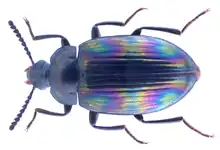 Body length is about 8 – 9 mm. Oval in dorsal view with smooth and shining dorsum. There is a multicolored metallic sheen on elytra in concentric zones of colors. Pronotum tinged with metallic luster in lateral sides and blackish in medial regions. Head, legs and ventral surfaces are black in color. Antennae serrate with 4-10 broadly triangular antennomeres. Males can be clearly identified due to meso-tibiae which is distinctly curved.[3]