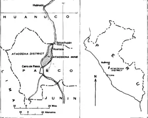 Three major mines in the area include the Machcan, Atacocha, and Milpo. Silver ore occurs in hydrothermal veins or as sulfides and clay minerals replacing the Jurassic Pucara limestone. Porphyry dacite stocks are found intruded near the Atacocha and Milpo mines along the Atacocha Fault. Compania Minera Atacocha started operations at the Atacocha Mine in 1936. Ore minerals include galena and sphalerite.[5]