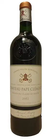 Château Pape Clément is a Bordeaux wine from the Pessac-Léognan appellation, ranked among the Crus Classés for red wine in the Classification of Graves wine of 1959. It is the oldest wine estate in Bordeaux, harvesting its 700th vintage in 2006.[1] The winery and vineyards are located in the commune of Pessac, south-west of the city of Bordeaux. When the estate was omitted from the initial Graves classification of 1953 it caused some controversy.[2]