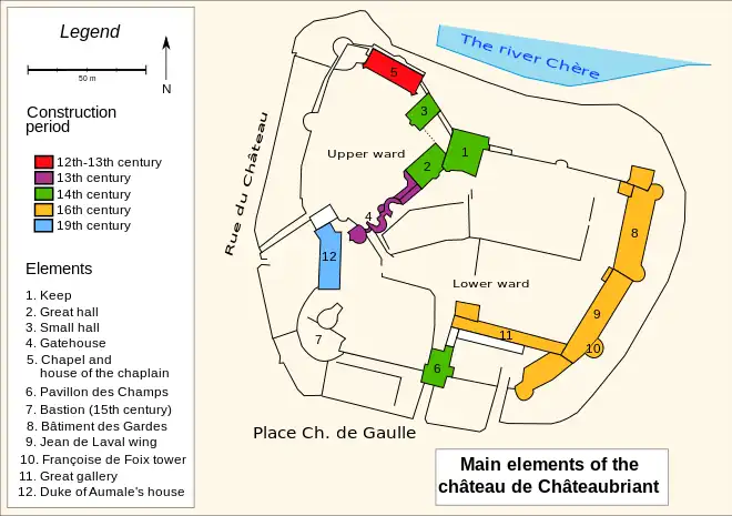 The first castle was a motte-and-bailey structure made of wood. It dominated the river Chère and the Rollard and had two concentric moats. One was dry, the other filled with water. It also had a big square keep, rebuilt in stone around 1100.[3] Two halls and a chapel were added during the 12th century, the latter being completed in the 13th century. In the same period, Châteaubriant emerged as a town on the banks of the Rollard. City walls were built between the 13th and the 15th centuries.[4]