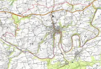 Châteauneuf-du-Faou is located in the middle of Brittany, between Monts d'Arrée and Montagne Noire. The town is built on a hill overlooking the Canal de Nantes à Brest, which is the canalized river Aulne. The bridge over this waterway was built in 1638, when Louis XIII was king of France, and is known as the "Old King's Bridge".[3]