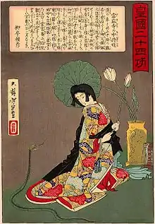 ![]() Chūjō-hime and the spirit of her wicked stepmother, represented as a snake. The lotuses are a reference to the Lotus Thread embroidery she wove. Woodblock print by Yoshitoshi | |