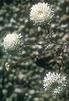The Mojave pincushion flowers are produced in a capitulum 3–6 cm diameter, and are white.[5]