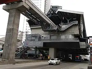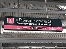 Chaeng Watthana - Pak Kret 28 station (Thai: สถานีแจ้งวัฒนะ - ปากเกร็ด 28) is a Bangkok MRT station on the Pink Line. The station is located on Chaeng Watthana Road in Pak Kret district, Nonthaburi province.[1] The station has four exits and is located adjacent to Central Chaengwattana department store.[2] It opened on 21 November 2023 as part of trial operations on the entire Pink Line.[3][4]