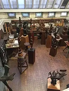 The townhouse was built in the 1830s and was converted to an industrial loft in the 1880s. The Gross family converted it into a residential space when they purchased the building in 1963.[1] The first floor is the artist's sculpture studio, featuring a dramatic skylight and an array of tools and materials related to the process of direct carving, which Gross pioneered in America in the late 1920s. Adjacent to the studio is a permanent installation of Gross' sculpture from the 1920s through the 1980s. The second floor features changing exhibits exploring themes in modern American art; past exhibits have examined the photography of sculpture, American surrealism, and direct carving. The Foundation also hosts related programs including artist's talks and poetry readings, as well as joint programs with the SoHo Arts Network, a consortium of downtown arts non-profits founded in 2015. The third floor is the family's living and dining space which remains as it was during the artist's lifetime, featuring a Salon-style installation by Gross of his wide-ranging collection.