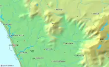 The Chaliyar originates in the Western Ghats range at Ilambaleri hills in the ranges of Nilgiri Mountains of Western Ghats,[5] which is also near Wayanad-Malappuram district border. Chaliyar flows through Malappuram District for most of its length and then for around 17 km it forms the boundary between Malappuram District and Kozhikode District before entering the city of Kozhikode for its final 10 km journey and finally empties into the Lakshadweep Sea at Beypore. Six major streams Chaliyarpuzha, Punnapuzha, Kanjirapuzha, Karimpuzha, Iruvahnipuzha and Thottumukkampuzha constitute the Chaliyar River drainage system. Other important tributaries are Kurumanpuzha, Pandipuzha, Maradipuzha, Kuthirapuzha and Karakkodupuzha. Most of these rivers have their origin in the Nilgiri hills in the east and Wayanad hills in the north, where they form a number of rapids and waterfalls.[5] Near the origin of river are the Meenmutty Falls at coordinates 11°31′40″N 76°14′12″E / 11.527755°N 76.236534°E / 11.527755; 76.236534 by Vaduvanchal, Wayanad