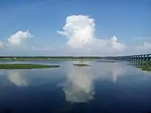 The Chamravattam Regulator-cum-Bridge, also known as Chamravattam Palam or Chamravattam Bridge, Chamravattam RcB, or Chamravattam Project, is built across Bharathapuzha aka Nila near Chamravattam, Triprangode, in Malappuram district. This seems to be the largest of its type in Kerala, India.[1] The bridge has 978 m (3,209 ft) length and 10.5 m (34 ft) width. It connects Ponnani and Tirur. Regulator cum bridge is now just working as a bridge due to faulty design as per the conclusion in the detailed technical investigation report done by the Indian Institute of Technology, Delhi on the directions of the Government of Kerala. There is also a false allegation that sand for construction was taken from river without payment for the same though the sand was paid for by the contractors at prices fixed by the Government of Kerala. This price was based on the prevailing sand prices in the open market and arrived at by the revenue department of Kerala. On account of these false allegations, the contractors for the work are yet to be paid in full for this work though it’s been nearing a decade since the work has been completed and the bridge has been used on a 24/7 basis throughout. [2]