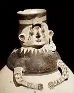 Other common ceramic vessels were oblong jars with narrow necks and wide mouths, with designs in the form of human faces and geometric shapes painted in the black on cream technique. Other common animal shapes are birds or llamas.[3] Another common class of items were cuchimilcos, small standing human-shaped idols with prominent jaws, wide black painted eyes, and prominent modeled genitalia. These figures are particularly notable for their unusual bodily position, which is characterized by upwardly extended arms with palms that face the viewer. The palms are often blackened. These figures have been found in the tombs of Chancay nobility.