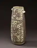 Vessels are often large and quaintly shaped. Egg-shaped jars are some of the more common. Ceramic dolls or female figurines were also created. These were usually large, female-looking dolls made from clay. The faces and sometimes the upper sections of the body are covered with ornaments of different geometric shapes.[1] Imprints of textiles on some ceramic human effigies demonstrate that human figures, often painted nude with body art, were dressed in real clothing, granting them reality and vital energy.[5] The eyes were accentuated with a line on each side and the arms were usually short.[3] These geometric ornamentations are very common on Chancay ceramics.[1]