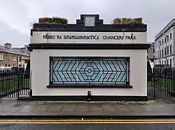 While the provision of recreational space was not common in the earlier years of public housing, the Chancery scheme also included a small 0.2-acre park named Chancery Park (Irish: Páirc Na Seansaireachta) on its northern side, intended for the use of residents.[11][10] While Chancery House was being refurbished in 2010, a full upgrade of the park was undertaken by Dublin Corporation's 'Parks & Landscape Services'. As part of these works, the original central cast iron fountain was restored to working order together with a new landscape design consisting of formal yew topiary plants. A small art-deco weighbridge "kiosk" building which abuts Chancery Street was also refurbished that year, including the provision of a new (square) clock by Stokes of Cork.[10] The kiosk includes a geometric stylised window grate and stepped parapet upon which the clock rests and several trees grow.[2] The name of the park is written in a stylised Irish font as well as English on the side facing Chancery Street.